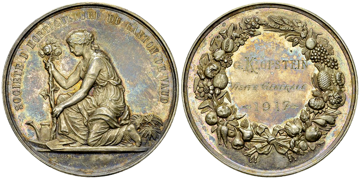 Schweiz, Waadt/Vaud. AR Medaille 1917 (50 mm, 68.96 g), Preismedaille der Société d'horticulture du Canton de Vaud, graviert "G. KLOPSTEIN / VISITE GÉNÉRALE / 1917".