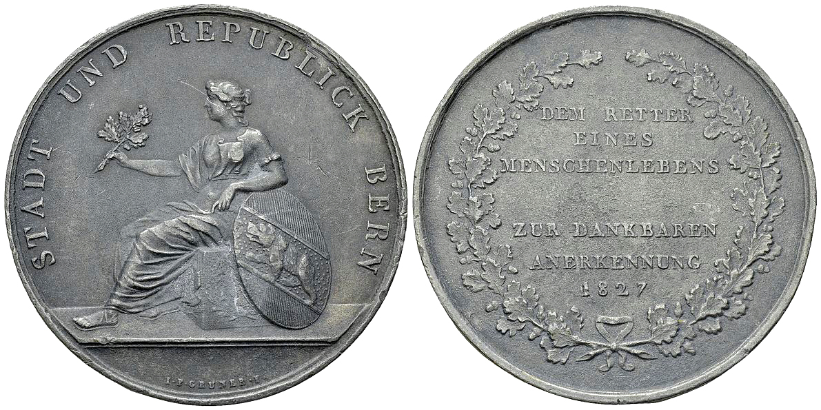 Schweiz, Bern. WM Medaille für Lebensretter 1827 (53 mm, 68.20 g), von Jakob Friedrich Samuel Gruner. Av. STADT UND REPUBLICK BERN, Auf lorbeergeschmücktem Quader sitzende Stadtgöttin nach links, die Linke auf den ovalen Stadtschild gestützt, in der ausgestreckten Rechten Eichenzweig; im Abschnitt I·F·GRUNER·F·. Rv. DEM RETTER / EINES / MENSCHENLEBENS / ZUR DANKBAREN / ANERKENNUNG / 1827 zwischen zwei Eichenzweigen. Slg. Wüthrich 434; SM 560 (jeweils AR).