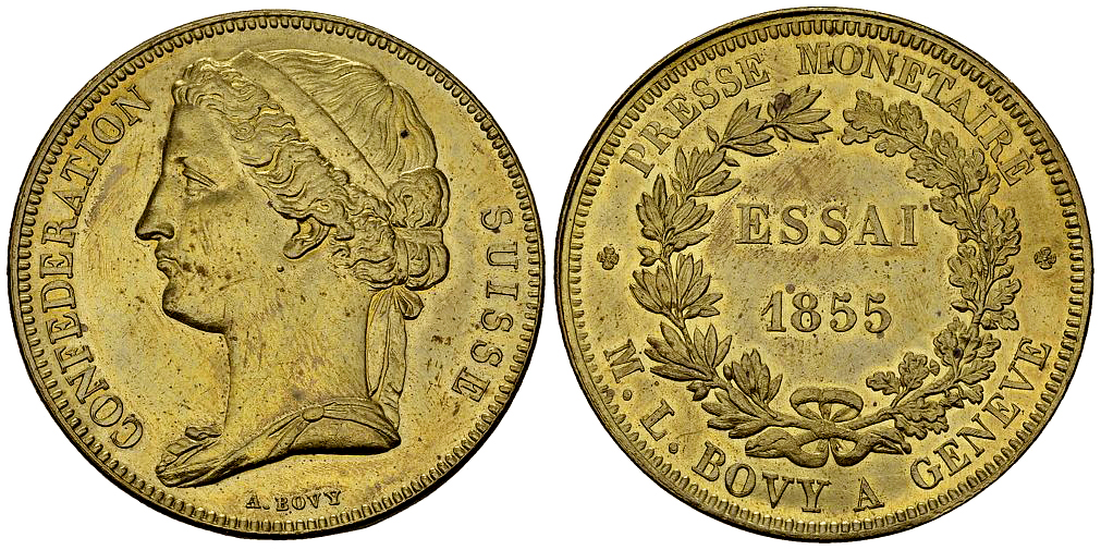 Schweiz, Eidgenossenschaft. ME Essai des 5 Franken 1855 (38 mm, 23.39 g). Von Marc Louis Bovy.