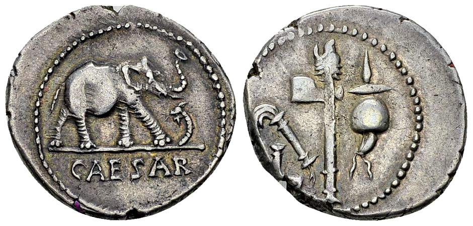 Obv. CAESAR, Elephant walking to right, trampling dragon.