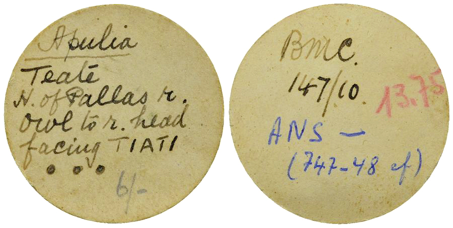 right, wearing crested Corinthian helmet. Rev. TIATI, Owl standing right; three