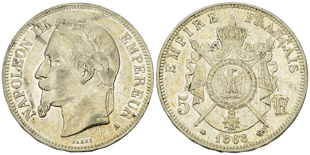 France, 2nd Empire. Napoléon III. AR 5 Francs 1868 A (25.11 g), Paris.