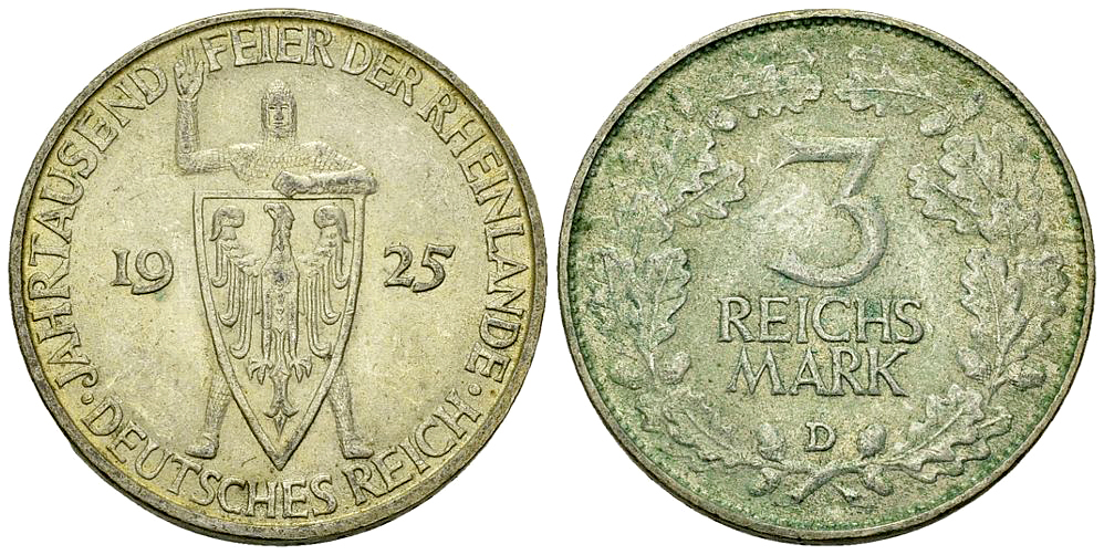 Deutschland, Weimarer Republik. AR 3 Reichsmark 1925 D (14.92 g), Rheinlande.