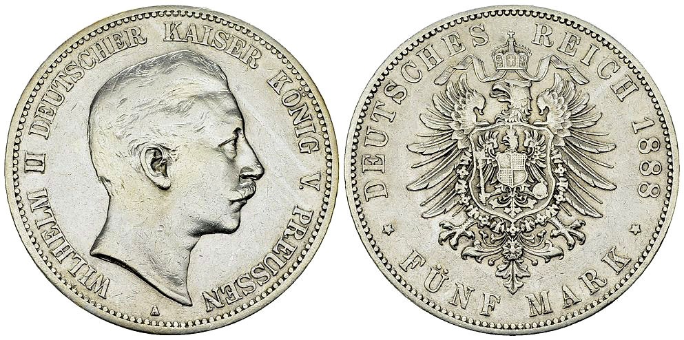 . Wilhelm II. AR 5 Mark 1888 A (27.54 g).