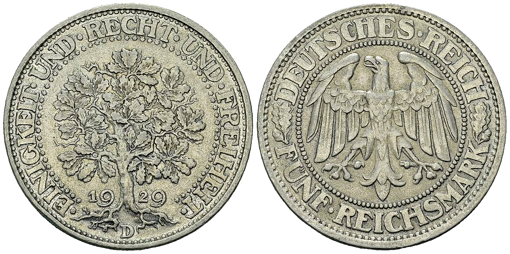 Deutschland, Weimarer Republik. AR 5 Reichsmark 1929 D (24.93 g), Eichbaum.