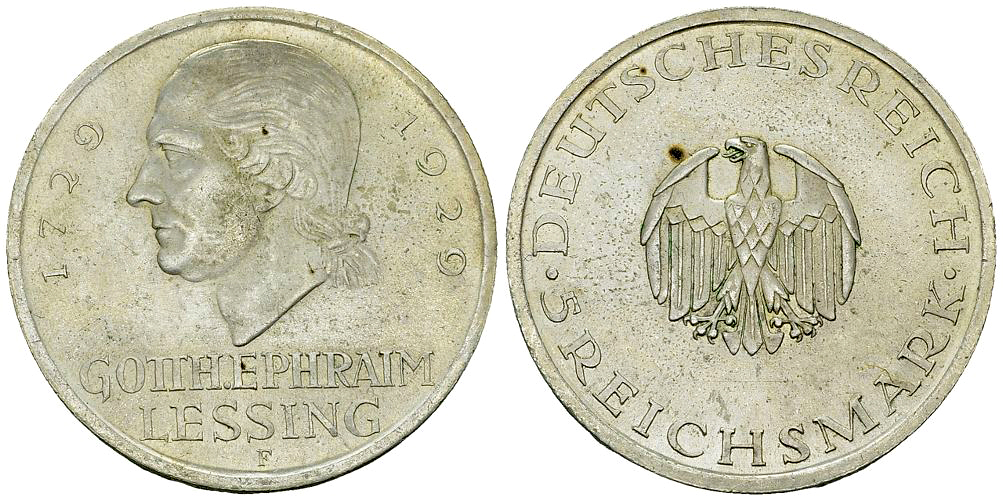 Lot 201. Weimarer Republik, AR 5 Reichsmark 1929 F, Lessing