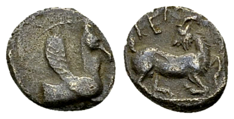 Cilicia, Kelenderis. AR Obol (9 mm, 0.73 g), c. 410-375 BC. Obv. Forepart of Pegasos to right. Rev. KEΛ, Goat kneeling