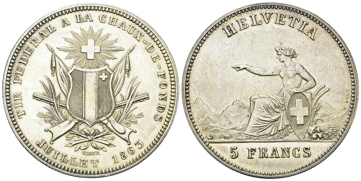 Lot 365. La Chaux-de-Fonds, AR 5 Franken 1863, Tir fédéral
