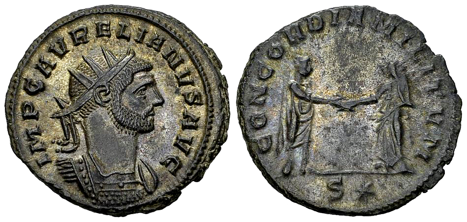 Aurelianus (270-275 AD). Silvered AE Antoninianus (20 mm, 3.52 g), Siscia, 274. Obv. IMP C AVRELIANVS AVG, Radiate and cuirassed bust to right. Rev. CONCORDIA MILITVM, Emperor standing to right, clasping hand of Concordia standing to left; S(star) in exergue. RIC 244; RIC online 2235, 2252 & 2302.