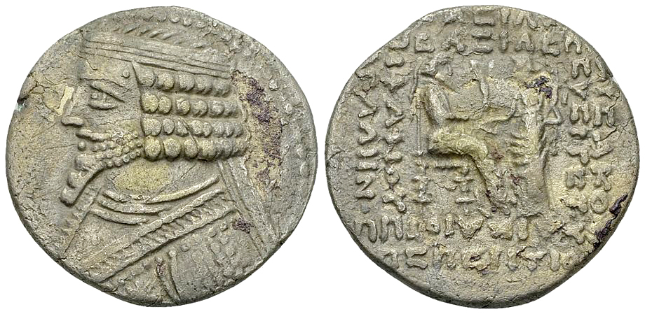 Rev. Phraates seated right, receiving palm from Tyche standing left before.