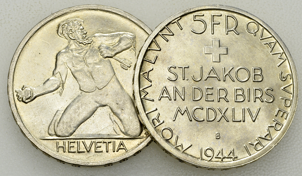 Schweiz, Eidgenossenschaft. Lot von 2 (zwei) AR 5 Franken 1944, 500-Jahrfeier der Schlacht bei St. Jakob.