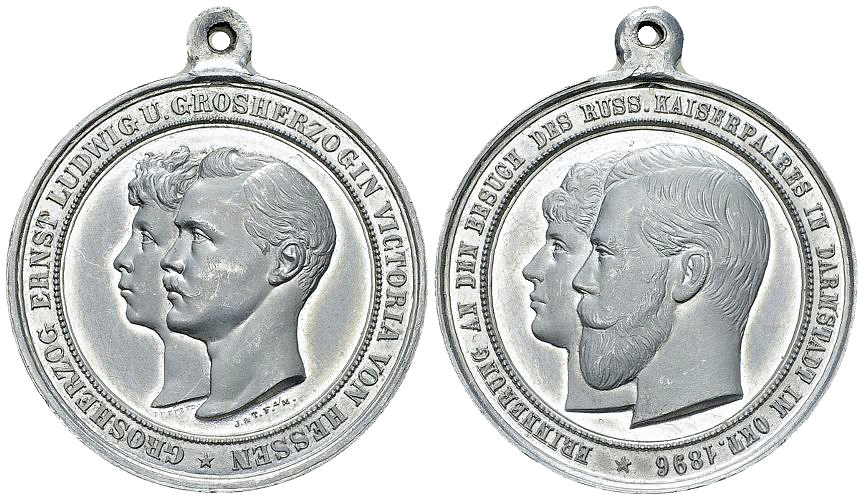 Deutschland, Hessen. AL Medaille 1896 (34 mm, 4.28 g), auf den Besuch des russischen Zarenpaares in Darmstaddt.