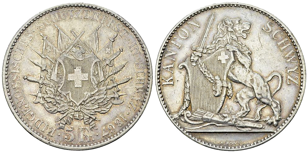 Lot 402. Schwyz, AR 5 Franken 1867, Eidg. Schützenfest