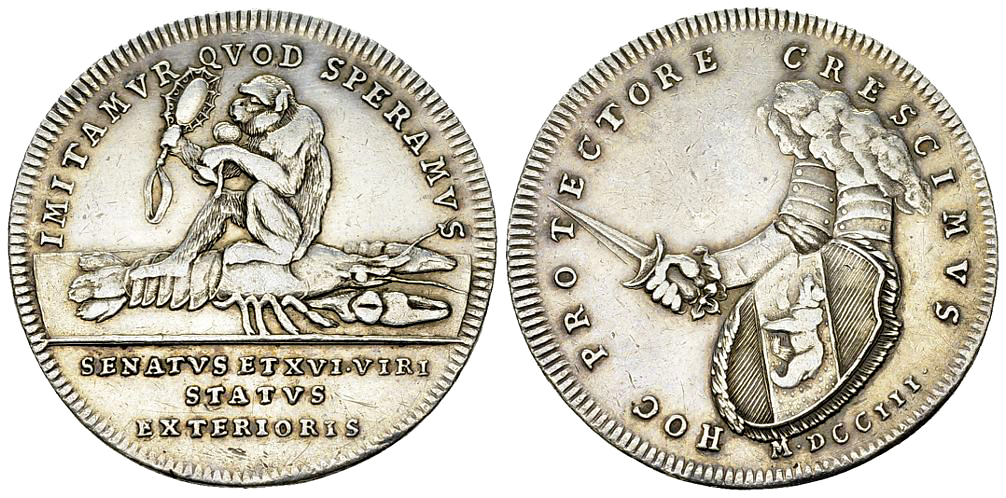 Av. IMITAMVR QVOD SPERAMVS, das Wappen des Äusseren Standes: Ein auf