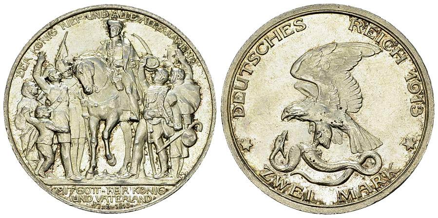 Deutschland, Preussen. AR 2 Mark 1913 A (11.11 g), anlässlich der Jahrhundertfeier der Befreiungskriege.