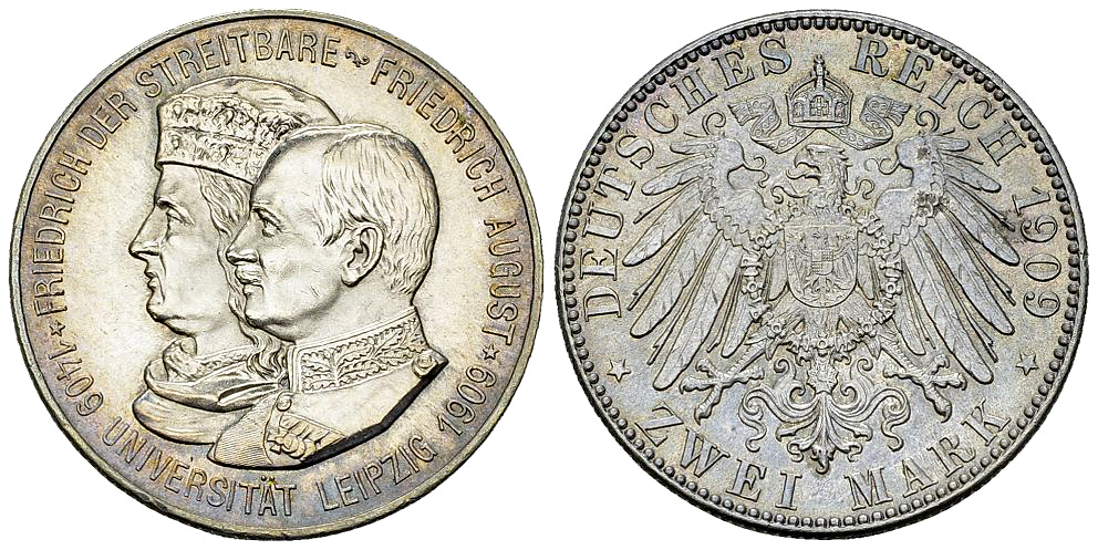 Deutschland, Sachsen. Friedrich August. AR 2 Mark 1909 E (11.13 g), anlässlich der 500-Jahfeier der Universität Leipzig.