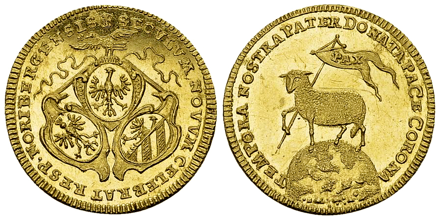 Deutschland. Nürnberg, Freie Reichsstadt. AV Lammdukat 1700 (3.48 g), ohne Mzm.-Signatur, in der Umschrift die Jahreszahl als Chronogramm. Slg. Erl. 589; Fr. 1885; Kellner 71.