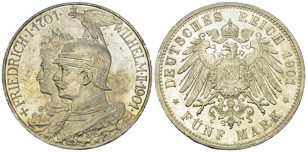 Deutschland, Preussen. AR 5 Mark 1901 A (27.76 g), anlässlich des 200-jährigen Bestehens des Königreiches Preussen.