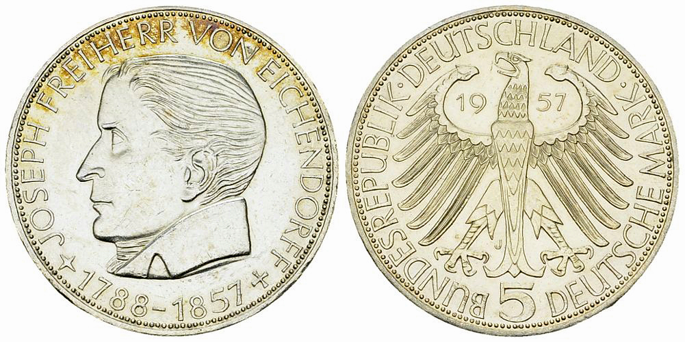 Deutschland, Bundesrepublik. AR 5 Mark 1957 J (11.19 g). Freiherr von Eichendorff.