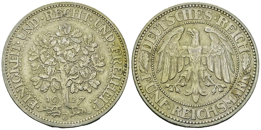 Lot 192. Weimarer Republik, AR 5 Reichsmark 1927 J, Eichbaum