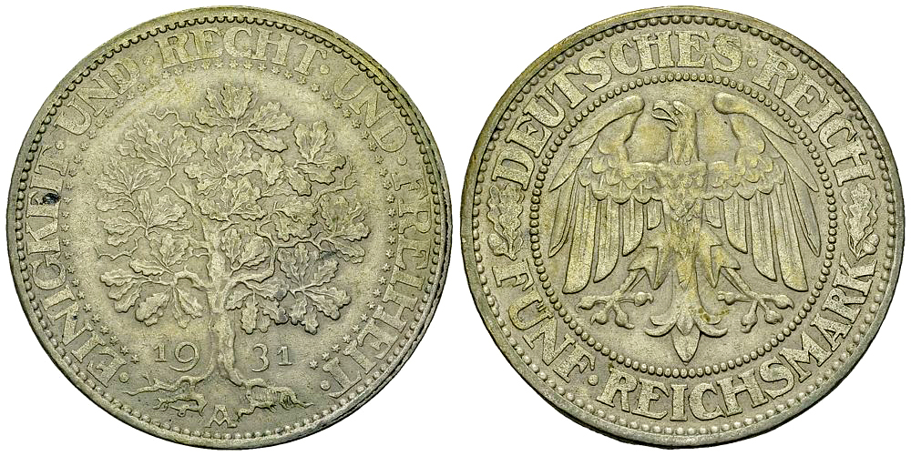 Los 208. Weimarer Republik, AR 5 Reichsmark 1931 A, Eichbaum