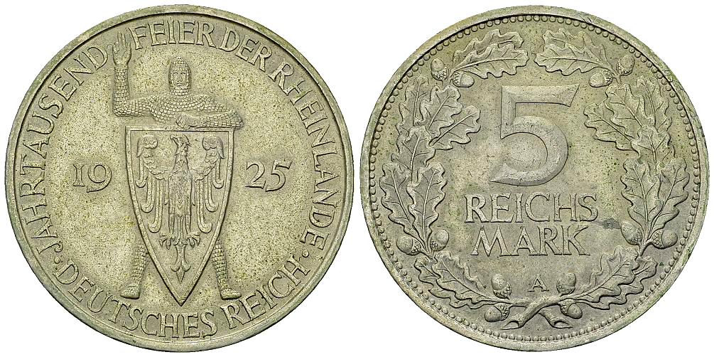 Los 186. Weimarer Republik, AR 5 Reichsmark 1925 A, Rheinlande
