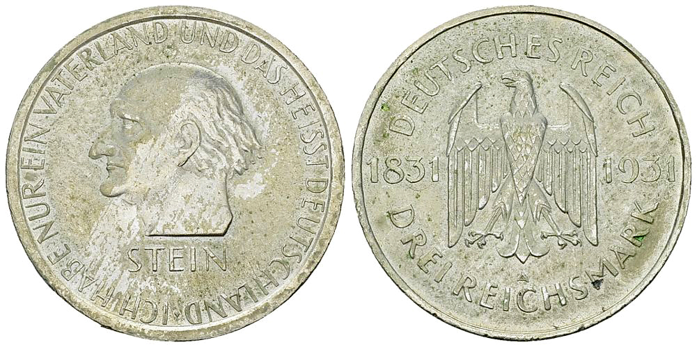 Lot 207. Weimarer Republik, AR 3 Reichsmark 1931 A, Stein