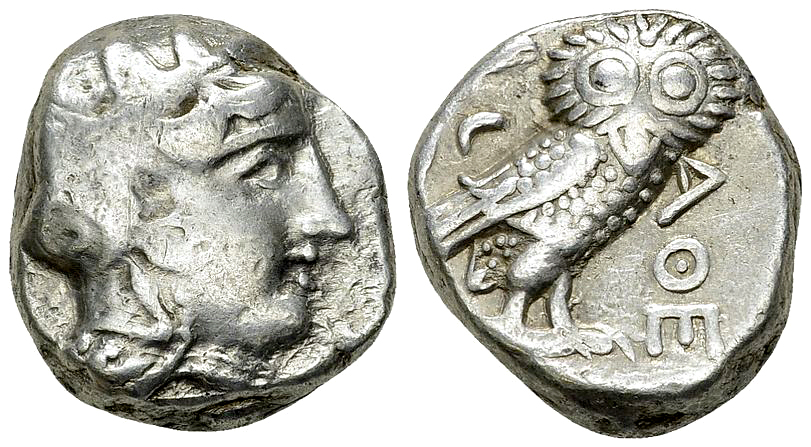 Obv. Head of Athena right with profile eye, wearing round earring, in