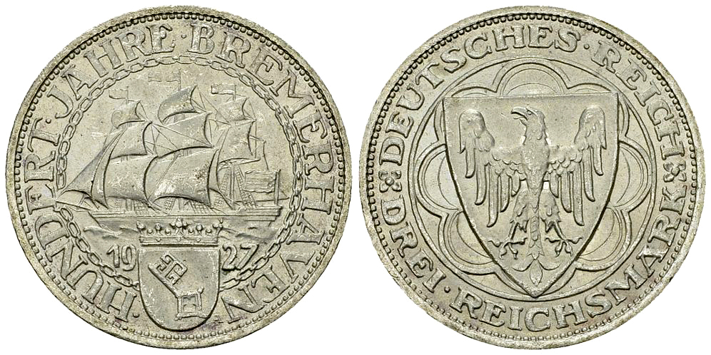 Lot 188. Weimarer Republik, AR 3 Reichsmark 1927 A, Bremerhaven