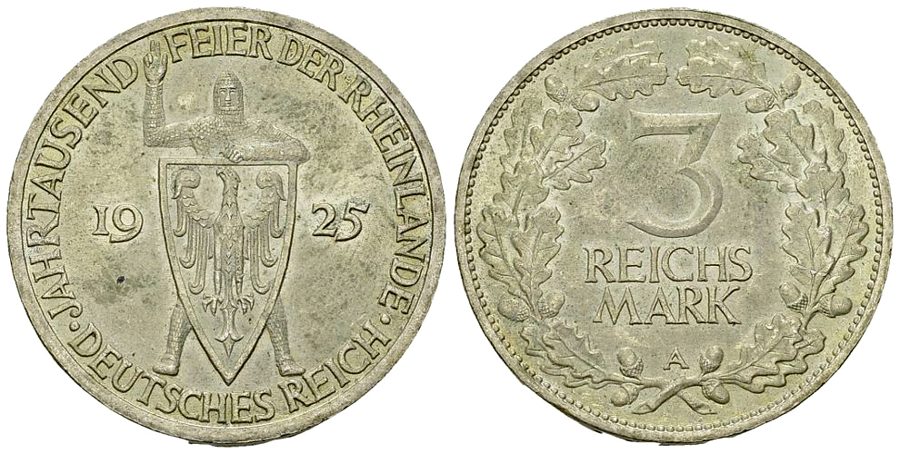 Lot 183. Weimarer Republik, AR 3 Reichsmark 1925 A, Rheinlande