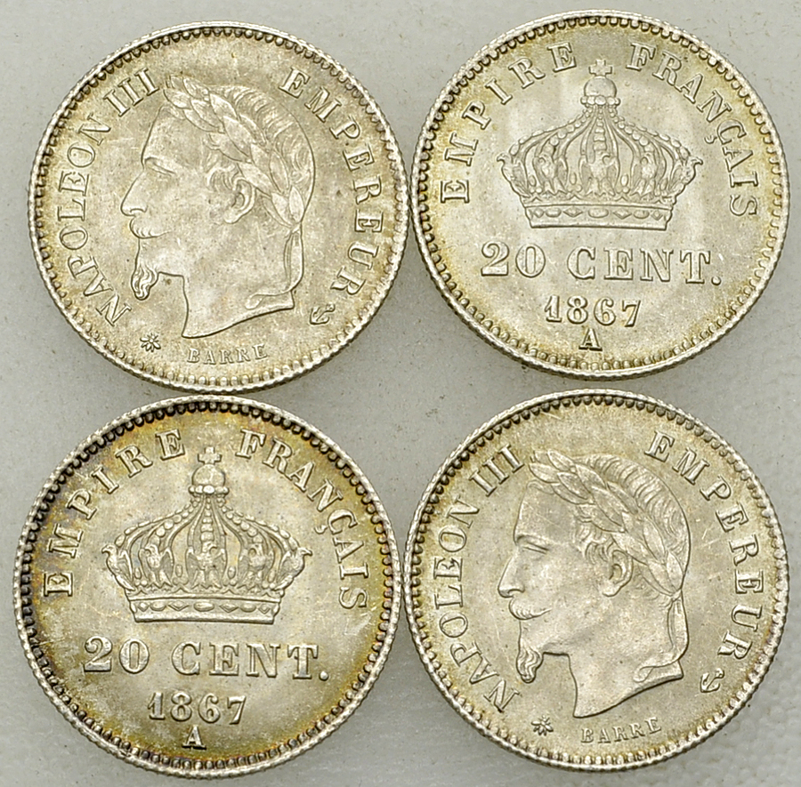 Lot 519. France, Lot of 4 AR 20 Cents 1867 A