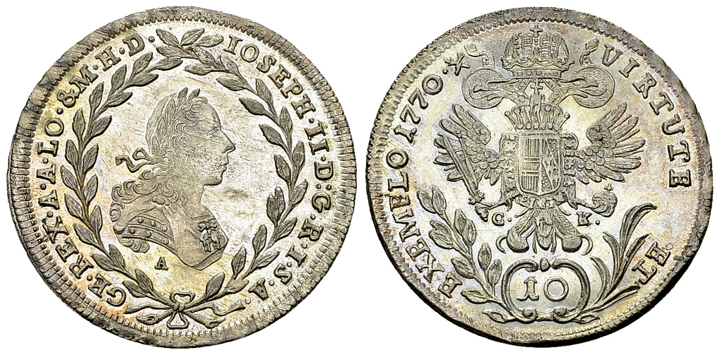 RDR. Josef II (1765-1790). AR 10 Kreuzer 1770 A CK (3.89 g), Wien. Mm. Johann Augustin Cronberg, Ward. Sigism. Ant. Klemmer. Her. 231.