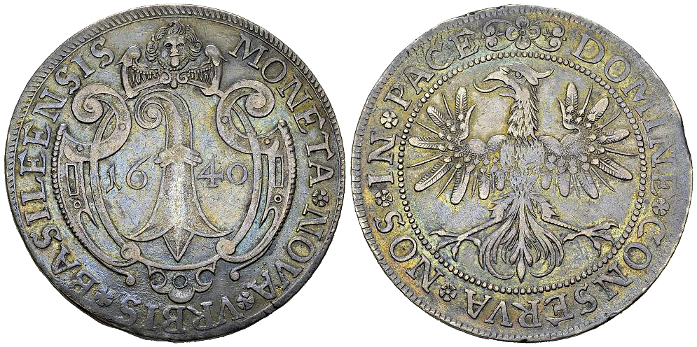 Schweiz, Basel. Städtische Münzstätte. AR Taler 1640 (41 mm, 28.46 g). Av. Baselstab in Kartusche, oben Engelskopf. Rv. Adler. DT 1337; HMZ 2-78q; Dav. 4606.